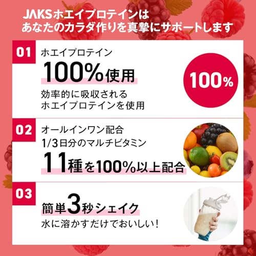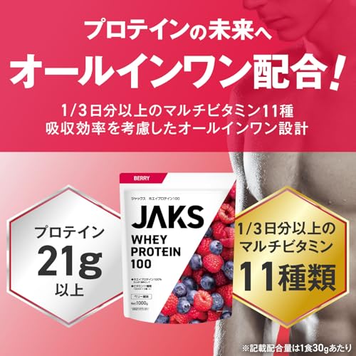 【激ウマ】 ジャックス JAKS プロテイン ホエイ 1kg 国内製造 おいしい 1食分のビタミン11種類 オールインワン配合 高たんぱく質 粉末 WPCプロテイン 溶けやすい (1kg, ベリー風味)